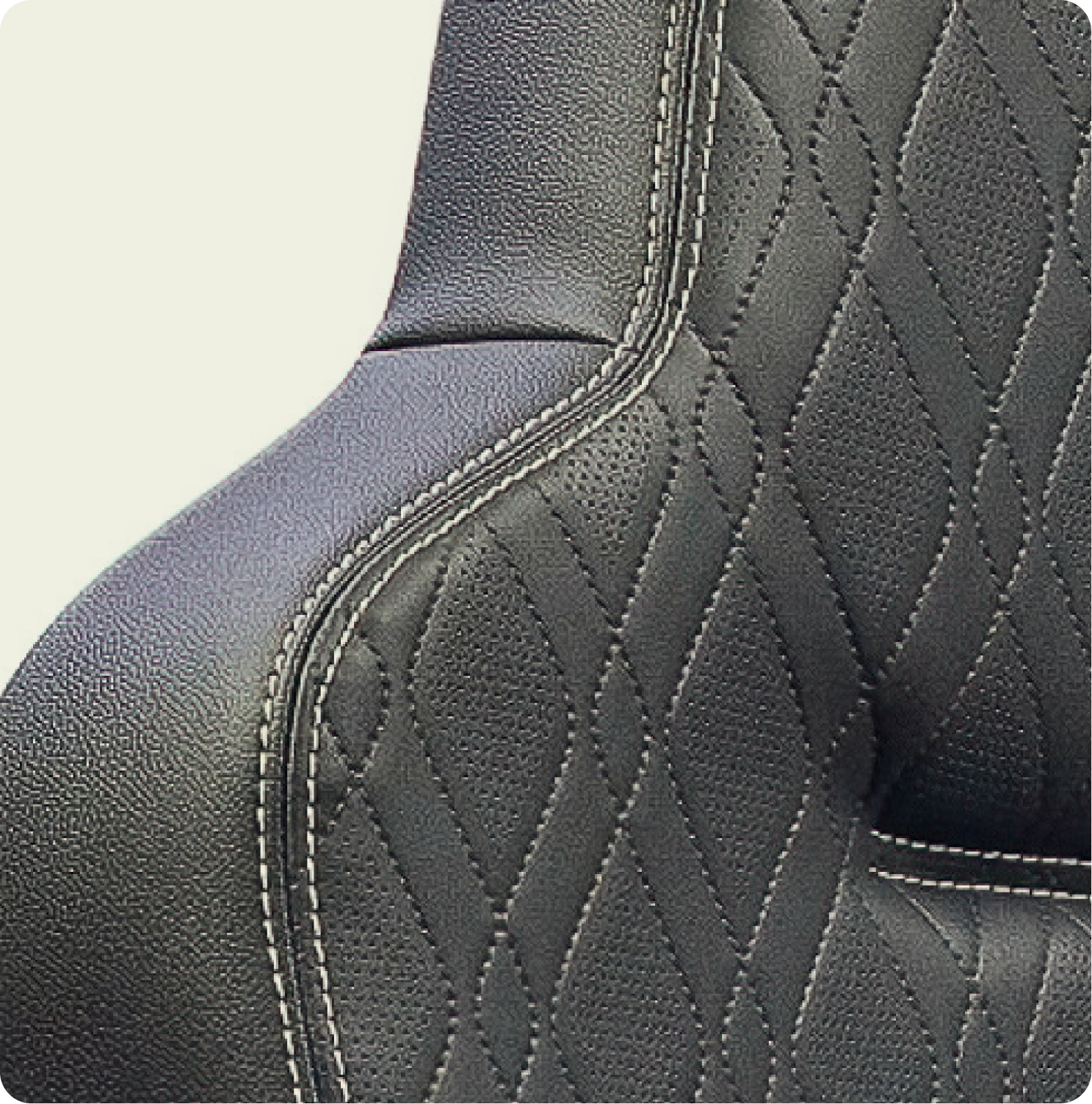 O banco é revestido em courvin vinílico de alta resistência. As opções de cores das capas e linhas de costura estão disponíveis acima na própria página do produto. Além disso, é possível personalizar com o bordado da sua logomarca.